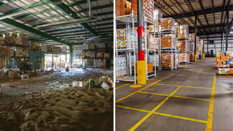 When Hurricane Helene devastated MANNA FoodBank’s facility (left), a $7 million grant from NCCF and CFWNC helped cover the remaining costs of completing its new facility (right).