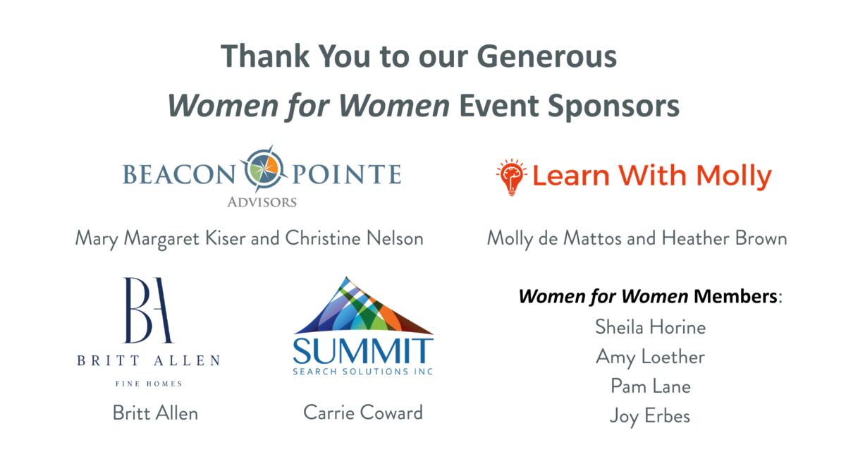Support from our annual sponsors keeps our events free or low-cost for members and nonprofit partners. It is also a wonderful way to publicly share your support of Women for Women with our members, guests and partners. Individual WFW members and their businesses can become annual sponsors.
